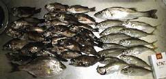 15cm前後の小アジを13匹、13cm前後のメバルを26匹、20cmのセイゴを1匹、18cmのウミタナゴを1匹釣る。